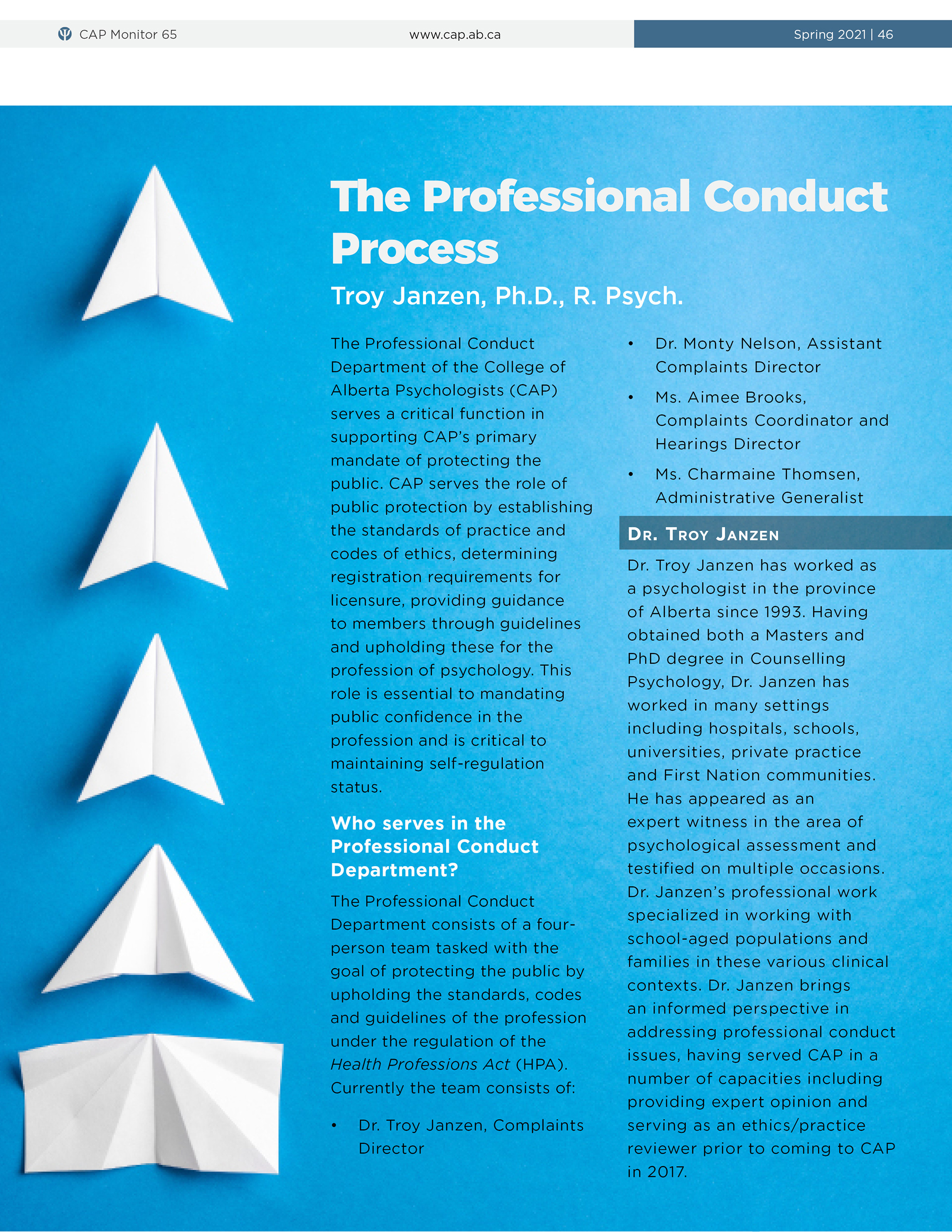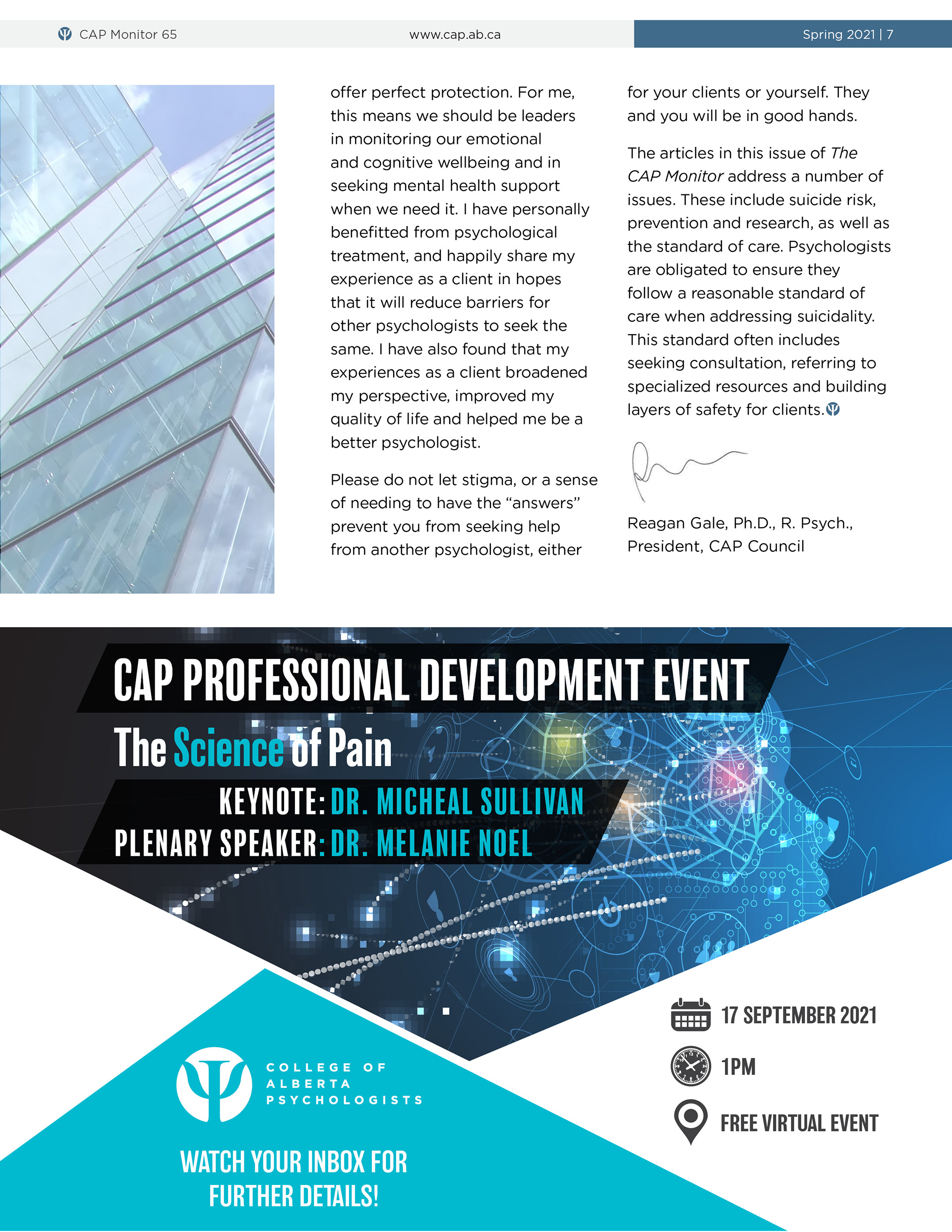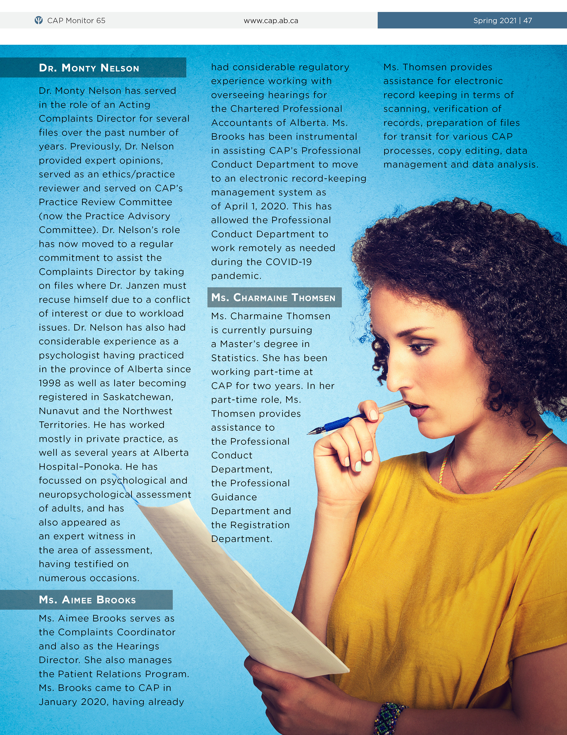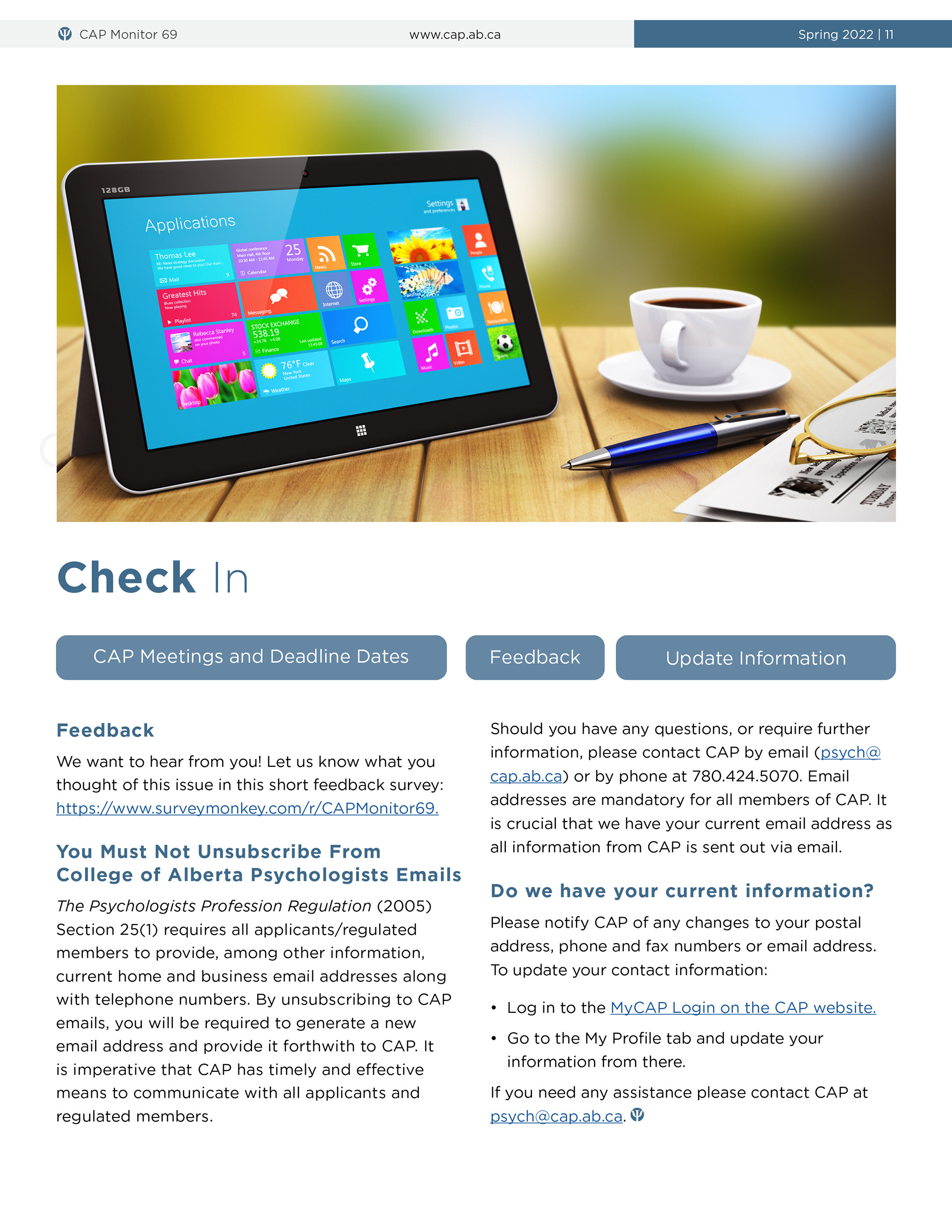Magazine layout that I created from scratch for the College of Alberta Psychologists (CAP Monitor)